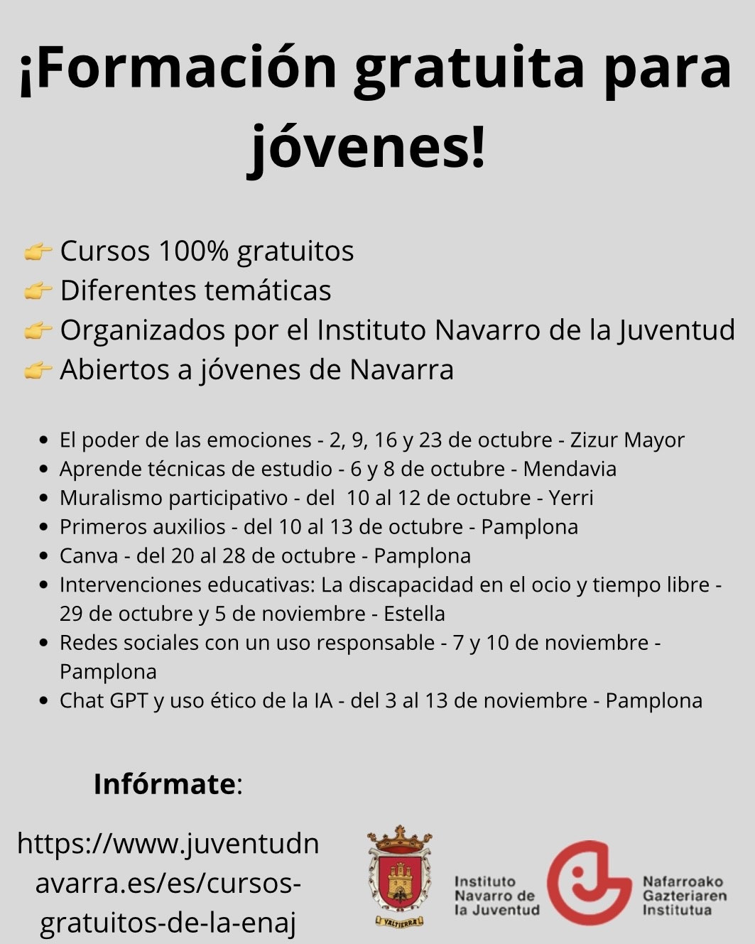 Infórmate en https://www.juventudnavarra.es/es/cursos-gratuitos-de-la-enaj