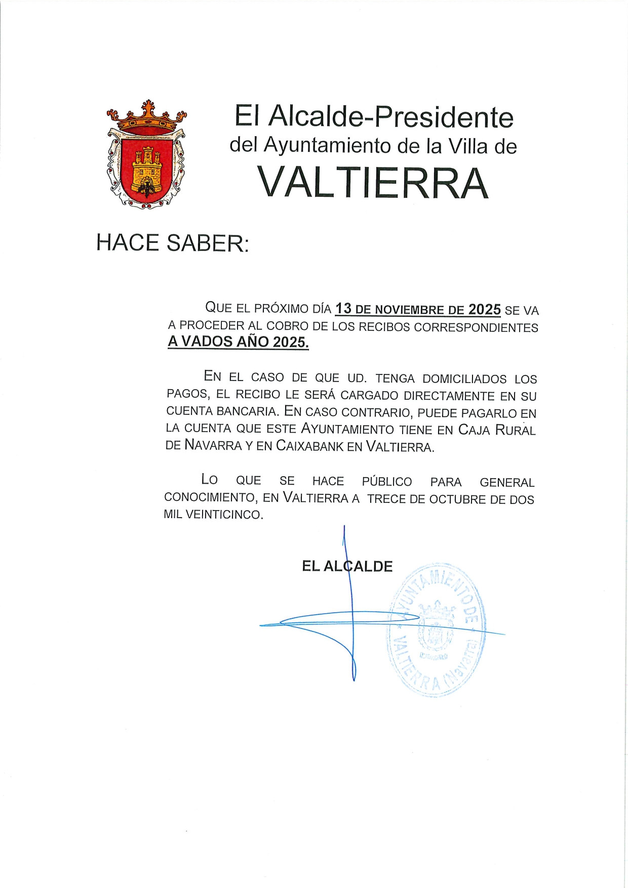 El Ayuntamiento de Valtierra informa de que el jueves 13 de noviembre de 2025 se procederá al cobro de los recibos correspondientes a los vados del añ...
