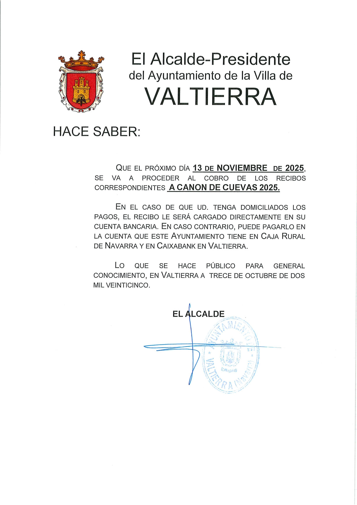 El Ayuntamiento de Valtierra informa de que el jueves 13 de noviembre de 2025 se procederá al cobro de los recibos correspondientes al canon de cuevas...