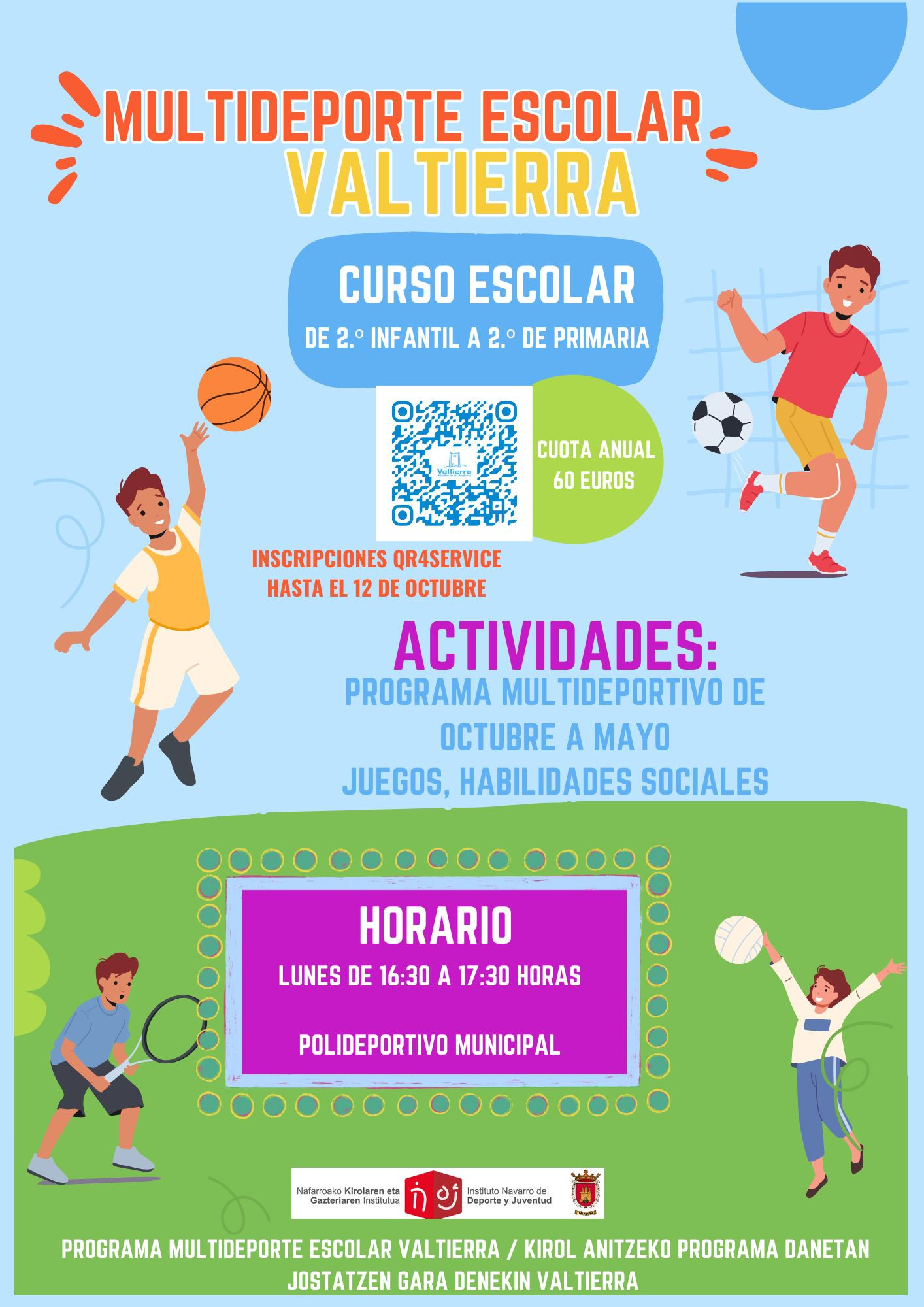 De octubre a mayo, los niños y niñas de 2.º de Infantil a 2.º de Primaria (nacidos entre 2017 y 2021) podrán disfrutar del Programa Multideportivo de Valtierra: juegos, habilidades sociales y mucha diversión en equipo.