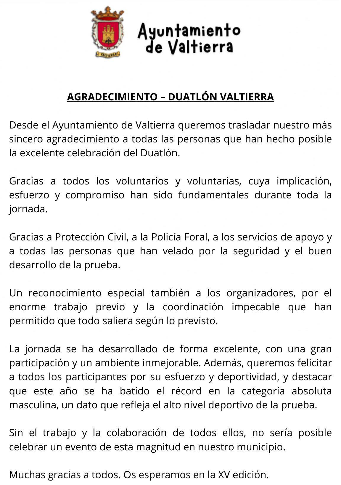 AGRADECIMIENTO DUATLÓN DE VALTIERRA