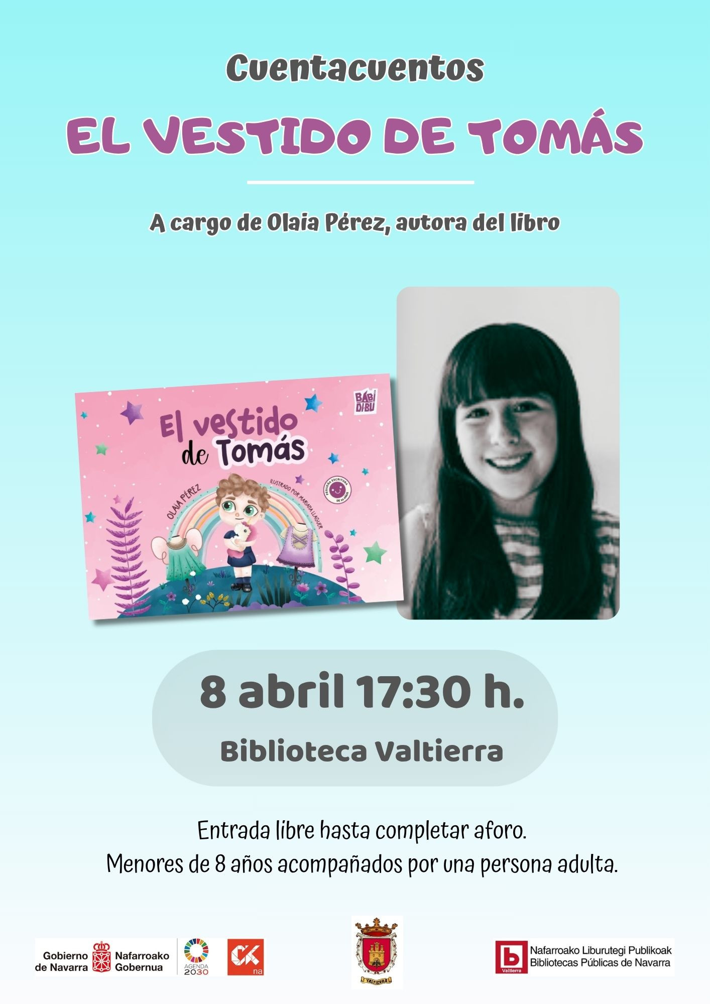La joven escritora pamplonesa Olaia Pérez, de 10 años, va a venir a la Biblioteca Pública de Valtierra a presentarnos su libro "El vestido de Tomás", editado por Babidi-bú e ilustrado por Mariana Llaguer.