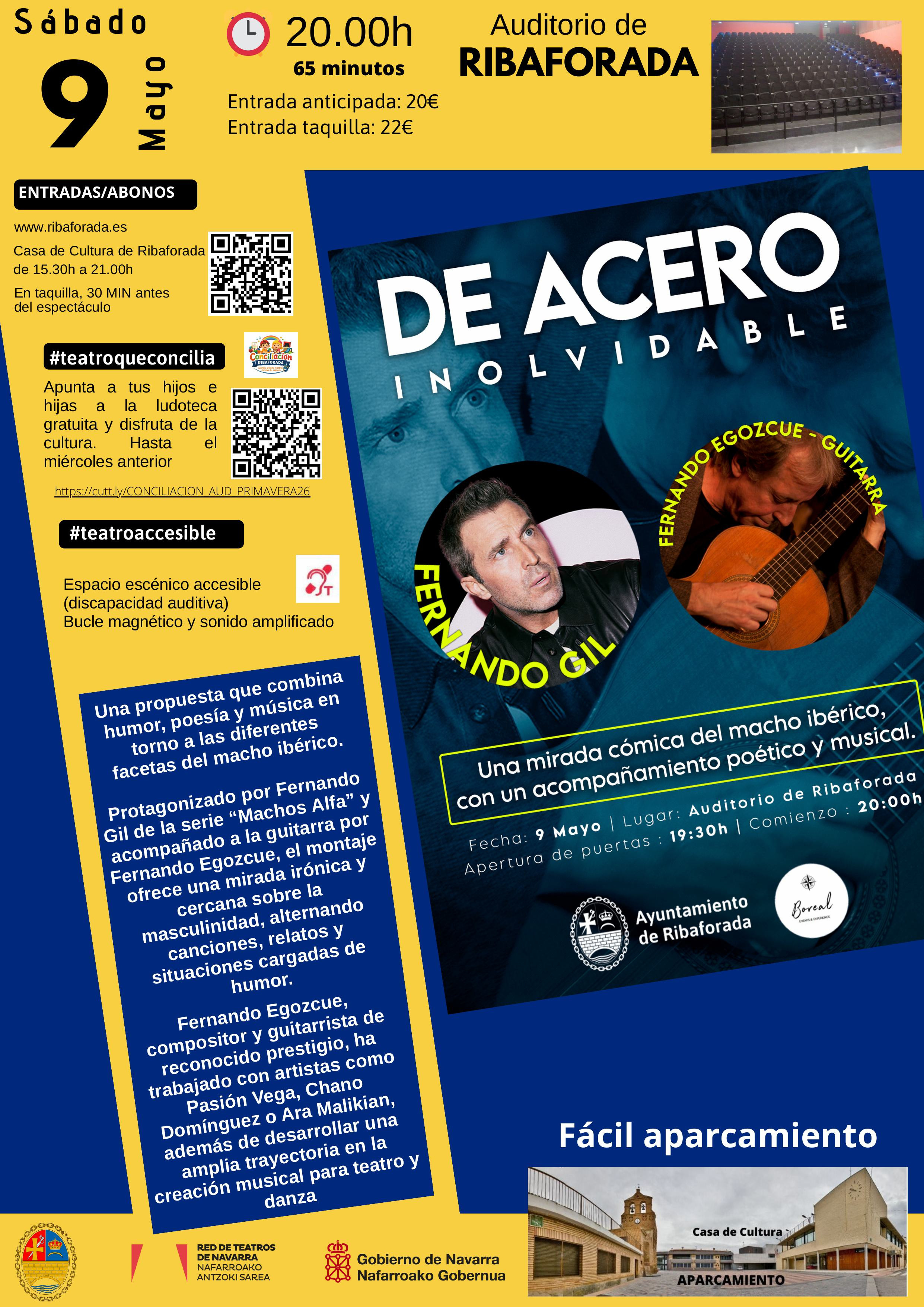 "De acero inolvidable", con Fernando Gil y Fernando Egozcue (guitarra). Entrada anticipada: 20 euros Entrada taquilla: 22 euros Venta online: www.ribaforada.es